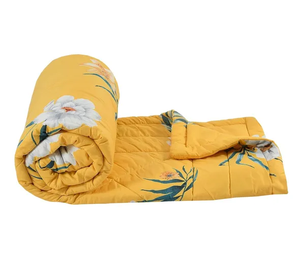 Introducing the MallowWorld Rotary Printed Micro Fiber Comforter, your ultimate companion for cozy nights and luxurious comfort. This double bed-sized masterpiece measures a generous 90x97 inches, providing ample coverage and warmth for a restful sleep experience. Crafted with precision and care, this comforter showcases the finest quality double weaving, ensuring its durability and long-lasting appeal. The innovative rotary printing technique used to create the intricate design ensures vibrant colors that won't fade over time, enhancing the visual appeal of your bedroom. Designed with your comfort in mind, this comforter features a unique blend of microfiber that offers a delicate touch against your skin. Its hypoallergenic properties make it an excellent choice for individuals with sensitive skin or allergies, promoting a healthy and peaceful sleep environment. Say goodbye to sleep disruptions caused by discomfort � the MallowWorld Comforter is here to revolutionize your slumber. Maintaining the cleanliness of your comforter is a breeze, thanks to its washable nature. This convenience ensures that your comforter remains fresh and pristine, maintaining its original allure even after numerous washes. No more worrying about stains or spills � simply toss it in the washing machine and enjoy a hassle-free cleaning experience. The soothing blue hue of the comforter adds a touch of serenity to your space, elevating the aesthetics of your bedroom decor. Whether your interior style is classic or contemporary, the timeless appeal of this comforter effortlessly complements a variety of themes. Embrace the warmth and opulence this comforter provides, making it your go-to choice for both chilly winter nights and cooler summer evenings. Snuggle up comfortably and let the stress of the day melt away as you wrap yourself in the luxurious embrace of the MallowWorld Micro Fiber Comforter.